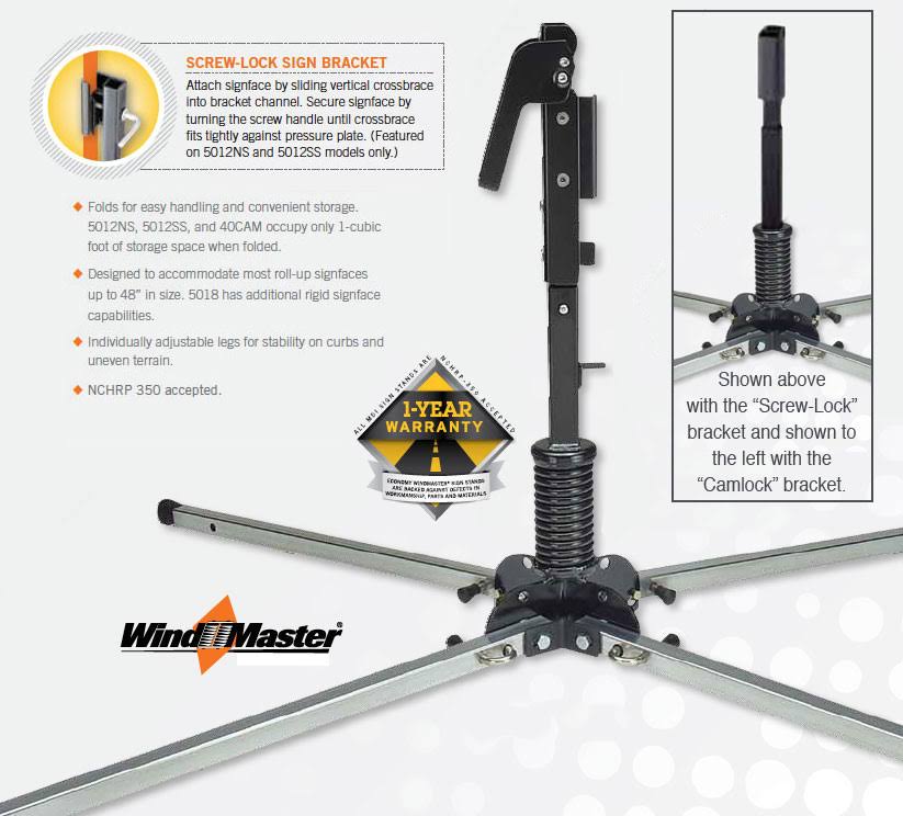 The Economy WindMaster® Roll Up Sign Stand takes up only 1 cubic foot of storage space and is designed for use with roll-up signs. Roll-up signs attach to the stand with a screw-lock sign bracket (included). Simply slide the vertical crossbrace into the bracket channel and secure the signface by turning the screw handle until the crossbrace fits tightly against the pressure plate. This Sign Stand (5012SS) features a single spring base design and adjustable, telescoping legs with kick-release buttons. Roll-up signs sold separately.
