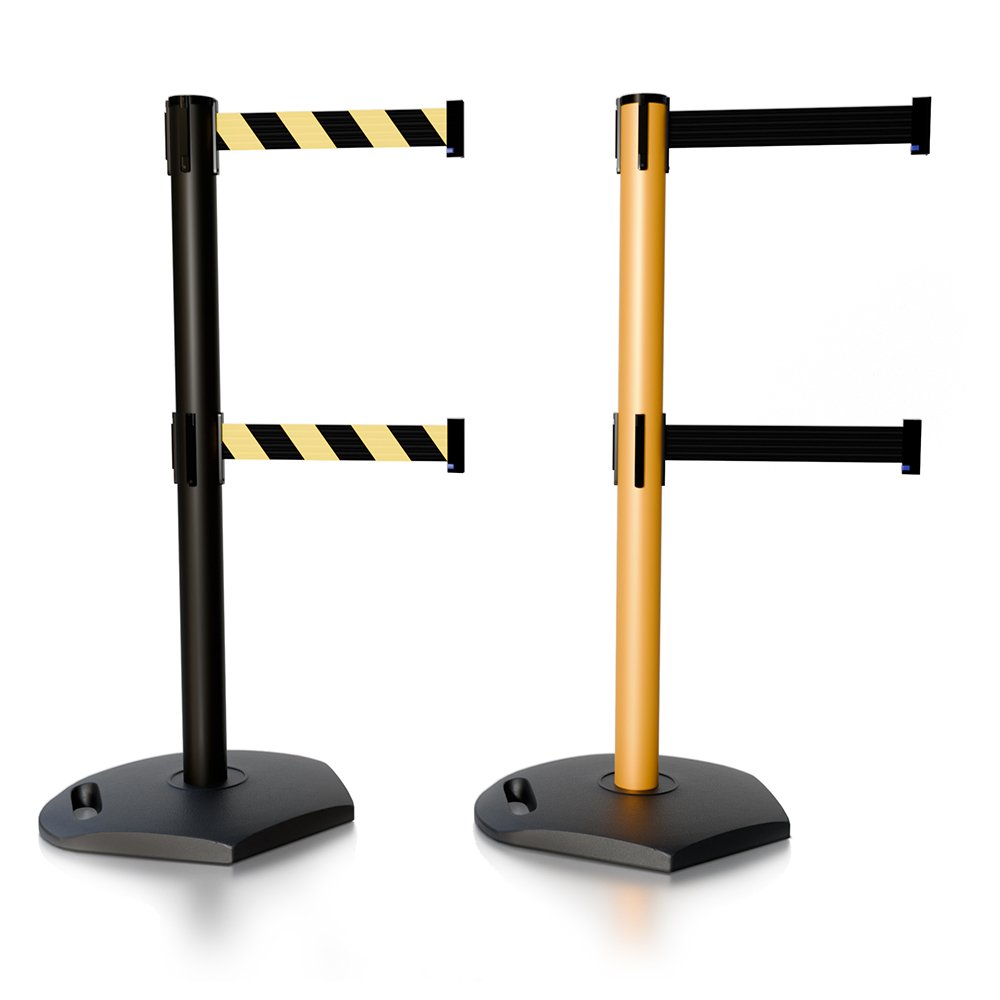Outdoor Retractable Dual Line Belt Barrier Post, 11 ft Belt, Rubber Base